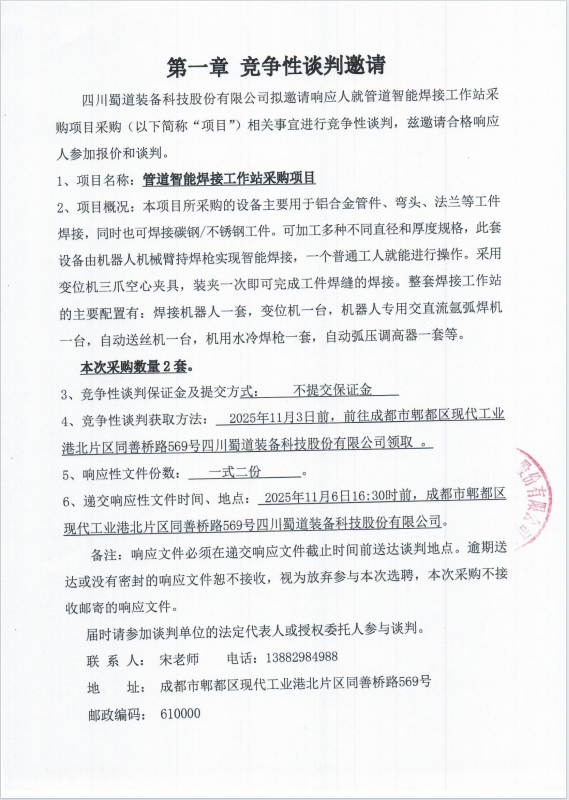 四川蜀道装备科技股份有限公司管道智能焊接工作站设备采购